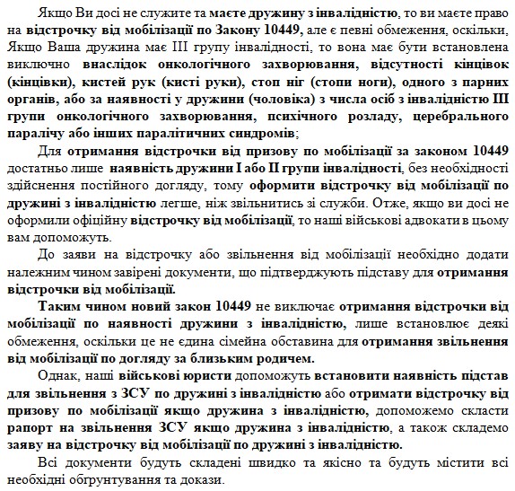 Відстрочка коли дружина інвалід 1 групи по Закону 10449 військовослужбовці, які мають жінку з інвалідністю 1-ї чи 2-ї групи, за допомогою наших військових адвокатів можуть отримати відстрочку або звільнитись від мобілізації на законних підставах.
